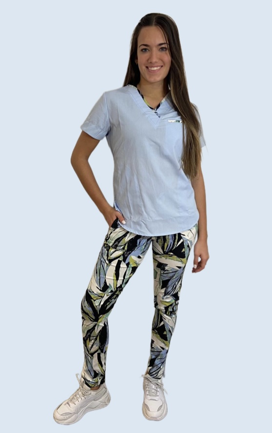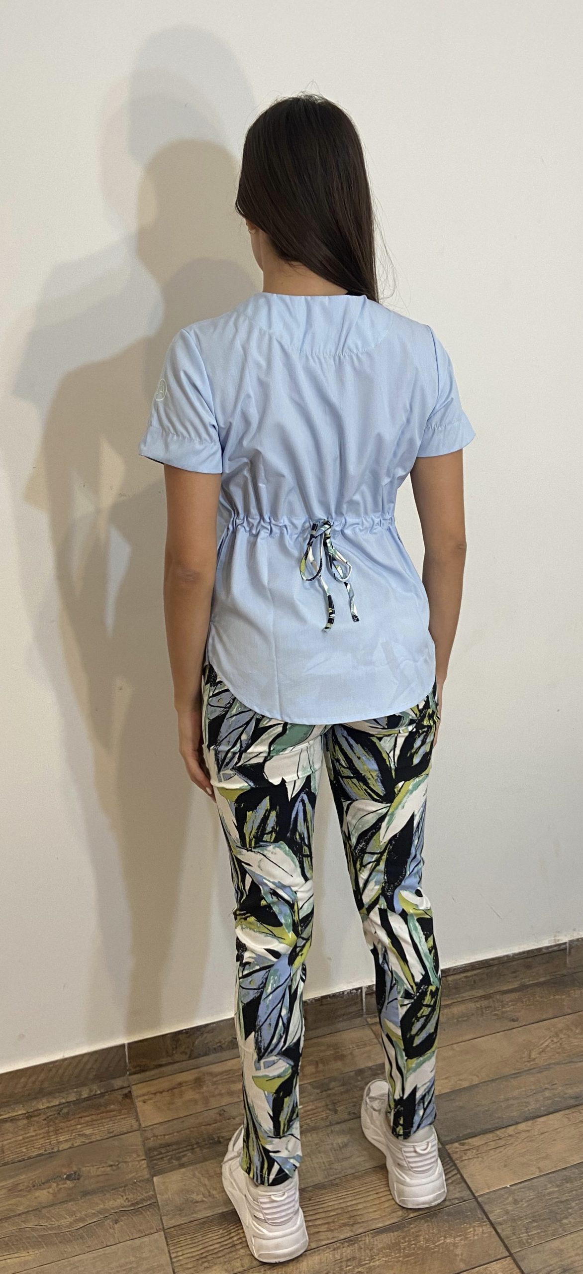 El Ambo Renata es modelo cuello en v , con bolsillos laterales , el color de la chaqueta es celeste cielo y tiene lazo en la espalda, para ajustar al entalle deseado, el pantalón esta diseñado en bengalina estampada estilo skinny.